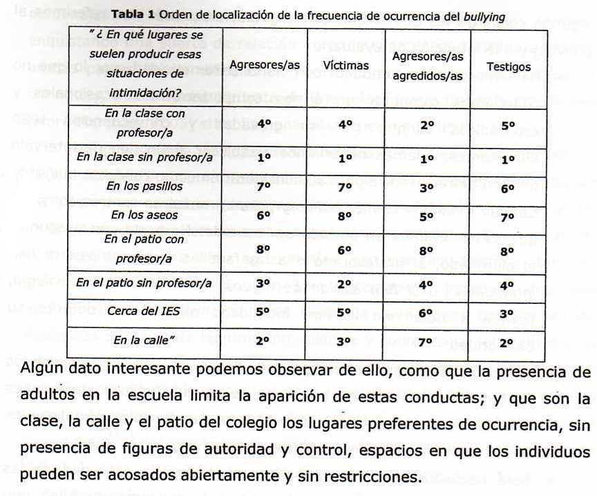 La tabla se encuentra del del artículo de José María Avilés Martínez El maltrato entre iguales (bullying), caracterización y consecuencias.
